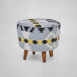 The pattern on this pouffe features geometric motifs, showcasing a texture and colours in shades of black, white, grey, and yellow. The footstool is supported by four sturdy mango wood legs, which have a warm, natural finish. This visually appealing and inviting footstool is perfect for extra seating.