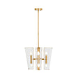The metal body of this pendant light is complete with a warm metallic finish that complements the four clear glass lanterns in a tapered shape. This pendant light is arranged around a circular base which lends a warming glow with double ended lamps.