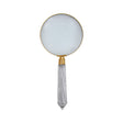 The Churchill handheld magnifying glass features a round brass frame in a warm metallic finish. This magnifier has a multi-faceted glass handle that brings a classic vintage charm to the office table or desk.