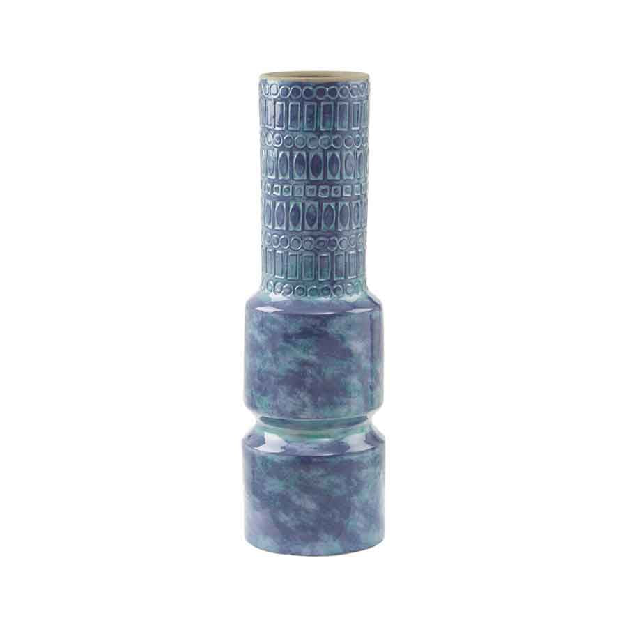 Tribal-inspired motifs decorate its mid-section, while its neck and base remain smooth to really accentuate the speckled teal finish. The vase is finished with a glaze to give it a smooth and slightly reflective look.