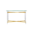 Two metal cross elements connect the Clarence console table's four legs and create a luxurious statement. The cylindrical legs are created from clear acrylic and complement the transparent appearance of the tempered glass top. Coordinate with warm metallic furniture and accessories for a contemporary look.