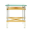 Four cylindrical legs made from clear acrylic support the Clarence coffee table. Their transparent appearance is complemented by a square tempered glass top, resulting in a contemporary looking accent piece. Two metal cross designs connect the four legs with a reflective gold finish lending them a luxurious aesthetic.