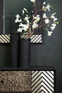 This earthenware vase has a jet black finish which is textured by indented vertical and horizontal lines. Conical in shape, the entire circumference of its rim is decorated by black latticed lace which runs through a series of round holes. Ideal for housing flower arrangements, use it to decorate a console or side table.