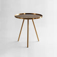 This side table features triangular splayed legs, made of durable iron in a smooth gold finish. An antique glass top in a round silhouette is set into the top with slightly elevated sides, adding to the table's weathered appeal.