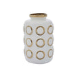 Made from white ceramic, this small vase has a smooth surface in a glazed finish. A series of gold warm metallic circles adorn the chic white surface with an open matching rim, and are sure to add a touch of luxe sophistication to a shelf or console.