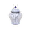 Featuring a classic curved design, this small jar features an exquisite blue and white striped pattern. A matching lid with a decorative finial sits at the top, furthering the traditional aesthetic.
