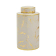 Handmade from sturdy ceramic, this small jar features a gold marble effect accentuated on the smooth white surface. With a cylindrical shape and removable lid, the jar stands out with gold pattern and rim detailing which create a luxe look.