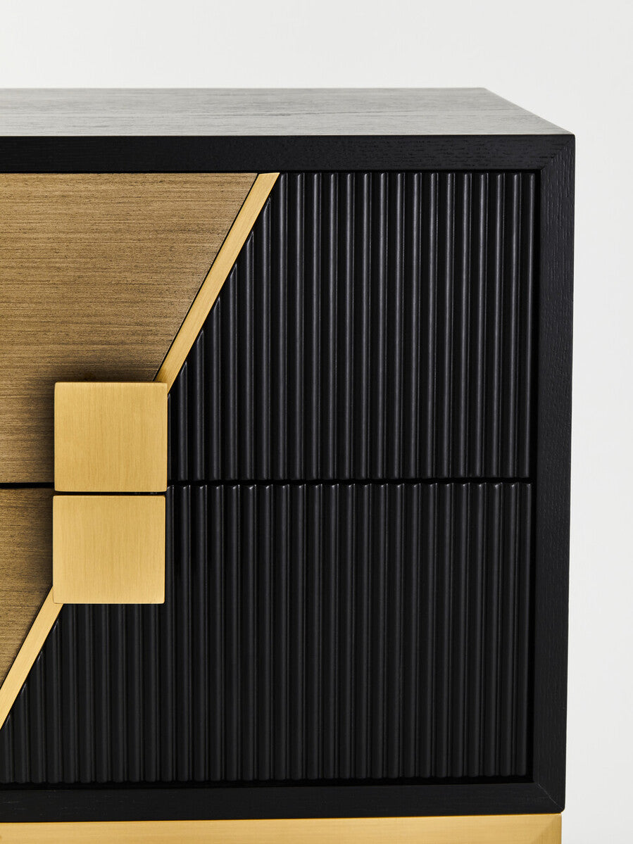 Bring a geometric effect in your room with Davoli 2 drawer side table featuring two tones and diagonal designs. The grains of the natural side are subtly contrasted by the fluted and textured black side. The chest is complemented by gold finished handles and a solid base.
