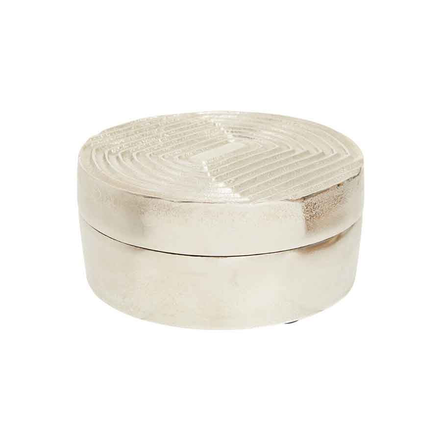 This small box is skilfully handcrafted from sturdy aluminium. The box in reflective nickel finish matches the removable lid that brings a touch of hypnotic detail at the top.