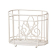 Scrolled metalwork forms floral patterns on the front and back of this utensil holder. It's made from strong metal, and formed into an oval cage structure with a wire lattice base that allows utensils to be displayed upright. The cream finish adds to its elegant appeal, while rounded feet keep it raised from kitchen surfaces.