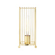 The lamp is raised by four feet, each one with a rounded design that introduces curved form to its otherwise angular aesthetic. Its cage structure is achieved by slim lines of metal that loop around the lamp's top section. It features a metal bulb fitting and has a gold finish that allows it to be coordinated with warm metallic accessories.
