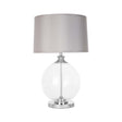 This table lamp has a contemporary glass and chrome design. The stepped design of the base and the rod being visible through the clear glass elevate elegance while a silver silk shade allows the lamp to easily blend in any decor.