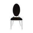 The Eliza dining chair has black velvet upholstery with oval shaped silver frame and sturdy white wooden legs offers a sleek and classic vintage feel that will complement any living space.