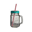 This mason jar mug features a handle to prevent hands warming its contents, and a coordinating straw. The fully transparent glass jar is embossed with the words mason and bocal en verre,adding to its rustic charm.