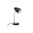 This contemporary desk lamp has a matte black head and base. It has a chrome gooseneck which can be adjusted to provide functional light for reading, writing or other practical tasks without causing eye strain.