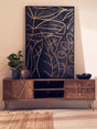 Standing atop sturdy hairpin metal legs in the warm metallic finish, this media unit boasts a wood veneering effect. The two drawers and shelving units of this media unit are capable of storing and showcasing necessary items.