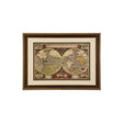 A brown frame, with a gold decorative design, helps to bring focus to the picture, accentuating its worldly look. Around the hemisphere's are decorative features including Elizabethan coat-of-arms, a vignette of Drake's ship the Golden Hind, and four corner illustrations, all enhancing it's dated look.