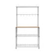 The two lower storage shelves and one at the top have a wireframe construction. Contrasting with this is the sustainable rubberwood section that can be used for food preparation as well as display space. A mid-section provides hanging space for pots and pans.