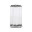 This candle holder has a rounded design featuring a series of fluted glass that refracts light and provides a warm glow. The symmetrical construction of glass is securely held by silver finish stainless steel rings on the top and bottom boasting a luxe aesthetic.