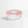 This 320ml square glass container has a pink PP lid with clip locks and a silicone seal that keeps the contents safely stored. The BPA free lid is airtight, making it ideal for food storage.