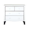 Each of the four drawers feature transparent cut-glass handles that are faceted to enhance their elegant appeal. A mirrored finish amplifies the table's luxurious aesthetic, while curved black feet add a dark counterpoint. Complementing the arched feet, the bottom drawer features an undulating bottom.