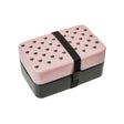 The light pink lunch box with black heartsis perfect for grab and go meals and comes with reusable cutlery. It has 2 stackable compartments to keep the food organised and fresh. A seal strap keeps the compartments in their place to prevent leakage.