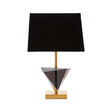 The smoked crystal lamp has a triangular design and a slender gold metal rod. The black shade provides a moden contrast to the gold accent, exuding a quality of contemporary luxury.