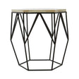 Made from resin, this side table has a hexagonal top featuring a distinctive geometric pattern in black and ivory hues. Its decorative top sits above a black finish iron wireframe which gives the design a modern aesthetic.