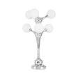 Standing on a round tiered base, the Heba 6 light table lamp has a chrome finish steel construction that reflects metallic silver hues. The ball detailing at the base and top give it a striking visual appeal. Each light of this lamp has a bowl shaped, white opal glass shade to create a soft, ambient glow.