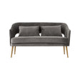 The tactile grey velvet upholstery has been pleated on the sofa's backrest, adding a sense of texture. Gold finish legs are slender and elegant and provide a stark tonal contrast to the muted tone of the soft upholstery. Two cushions perfectly finish this distinctive design piece and enhance its comfort.