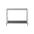 This console table features two black mirrored glass shelves supported with a stylish stainless steel frame. The frame has a smooth nickel finish with a modern cross design at each side, complete with decorative corners.