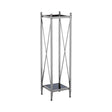 The tall plant stand features two square shelves made from black mirrored glass, with one situated close to the ground and the other at the top. The shelves are supported by a strong metal frame with a cool silver finish.