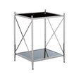 Two rectangular shelves made from black mirrored glass are supported by an elegant metal frame with a striking silver finish. A geometric cross detail adds a contemporary touch to each side.