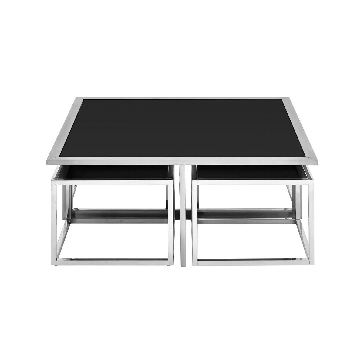 Four small, low profile tables nest under the large square coffee table. Each piece has a top made from tempered glass. The black glass contrasts with the reflective silver finish stainless steel frames.