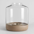 Its removable shade is made from clear glass and has a bottle neck that accentuates its tapering shoulders. The base is made from sustainable mango wood with a small plinth at the centre designed to hold a pillar candle. The subdued tones of this handcrafted accent piece make it suited to cool Nordic interior design settings. *This item is handcrafted so please expect slight variations to the finish*