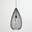 Crafted from sturdy iron in black finish, this intricate light features a sleek, moulded wire, teardrop-shaped frame which creates a geometric pattern design. The openwork frame allows for ample and ambient light to refract through the tubular bulb.
