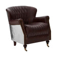 Its slightly winged backrest and scrolled arms are inspired by classical design, the lines accentuated by the metallic stud detailing. Tufting on the seat and backrest give the coffee coloured leather a textured look. Its carved feet are crafted from walnut wood.