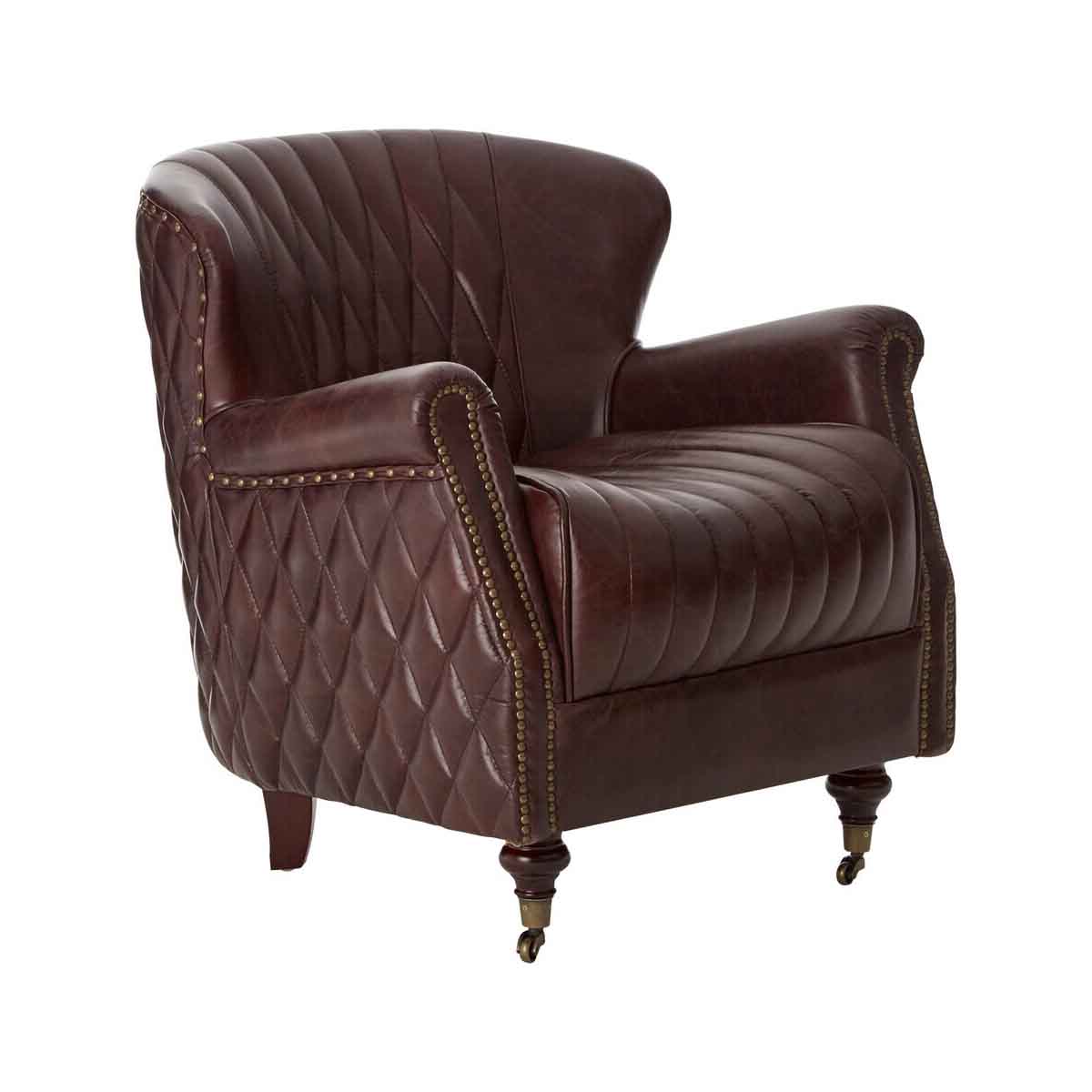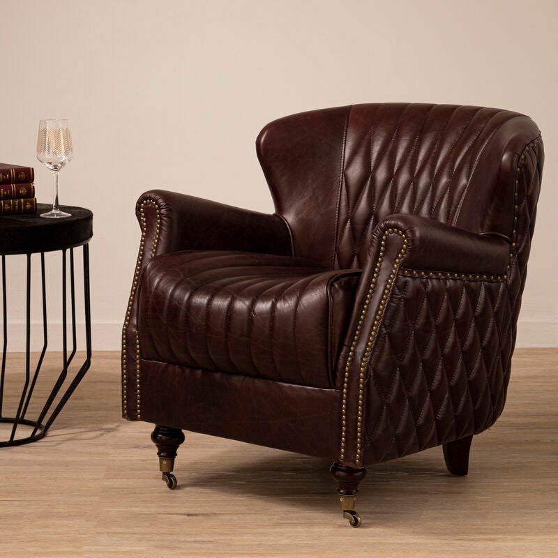 The leather upholstery features a variety of tufted designs - diamond patterns decorate the back and backrest, and channel tufting patterns the seat. Stud detail follows the contours of the arms, and carved walnut wood feet are coloured black to complement the coffee leather.