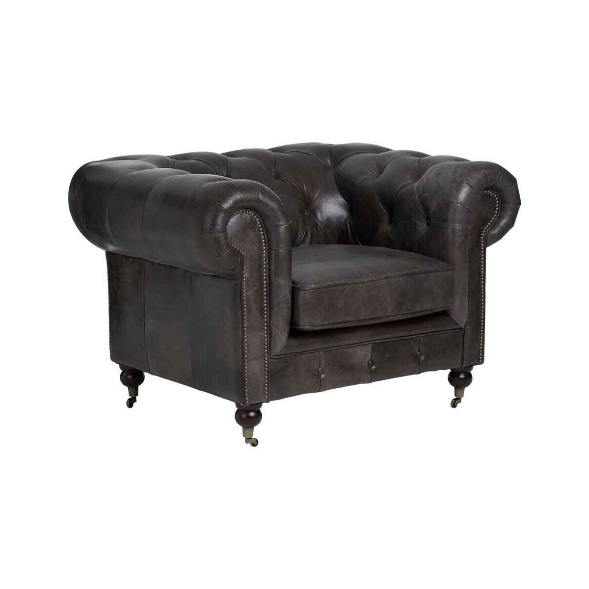 ""Metallic studs trace the lines of the large rolled armrests, and the traditional Chesterfield style is accentuated by the button tufted backrest. Its carved feet are crafted from solid walnut wood, and each one features a small caster wheel."