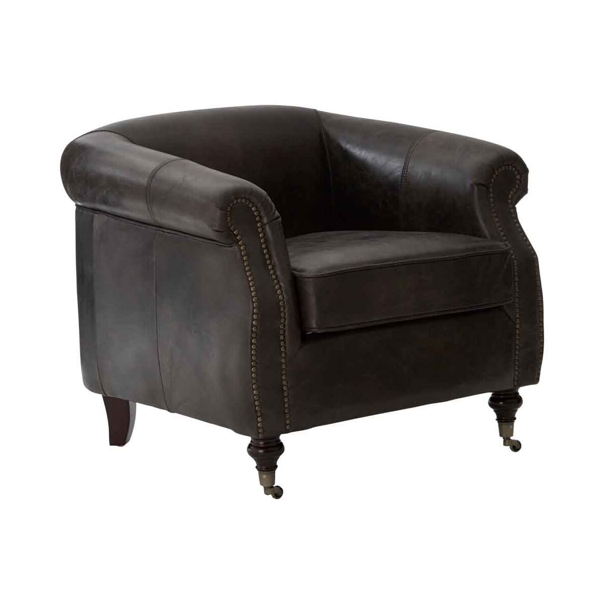 This stylish chair is upholstered with soft grey leather. Metallic studs accentuate the lines of each armrest with a copper colour that complements the grey. Its feet are carved from solid walnut wood.