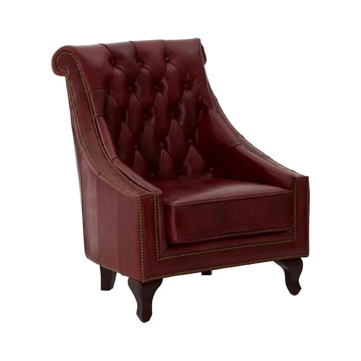 The Victor leather armchair makes an impression thanks to its quilted backrest and rich red colour. Copper finish metal studs trace the lines of its sweeping arms. Its cabriole-style legs are carved from solid walnut wood.
