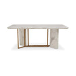 This Vieste dining table has rectangular white mable top and supported by gold polished base and marble pieces. The sleek design of this table contributes to the minimalistic charm of mid-century design.