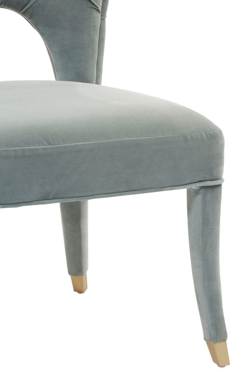 Deep button tufting decorates the front and back of its arcing backrest. The backrest sweeps down to meet a thick padded seat, with gold finish metal tipping the feet of its curving legs.