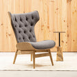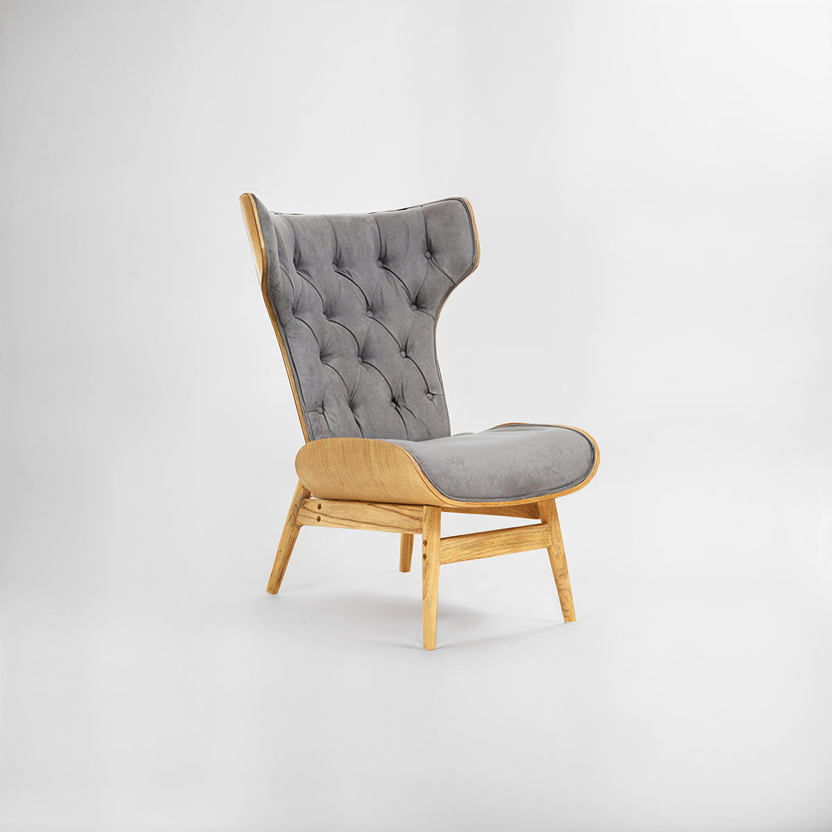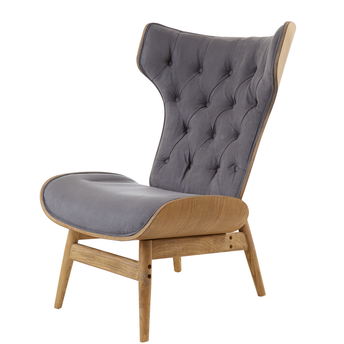 This chair is designed to create a fresh, contemporary look. The seating offers extra comfort with button tufted dark grey velvet on the winged back. The frame is made from solid elmwood to create elegant curves on this modern chair.
