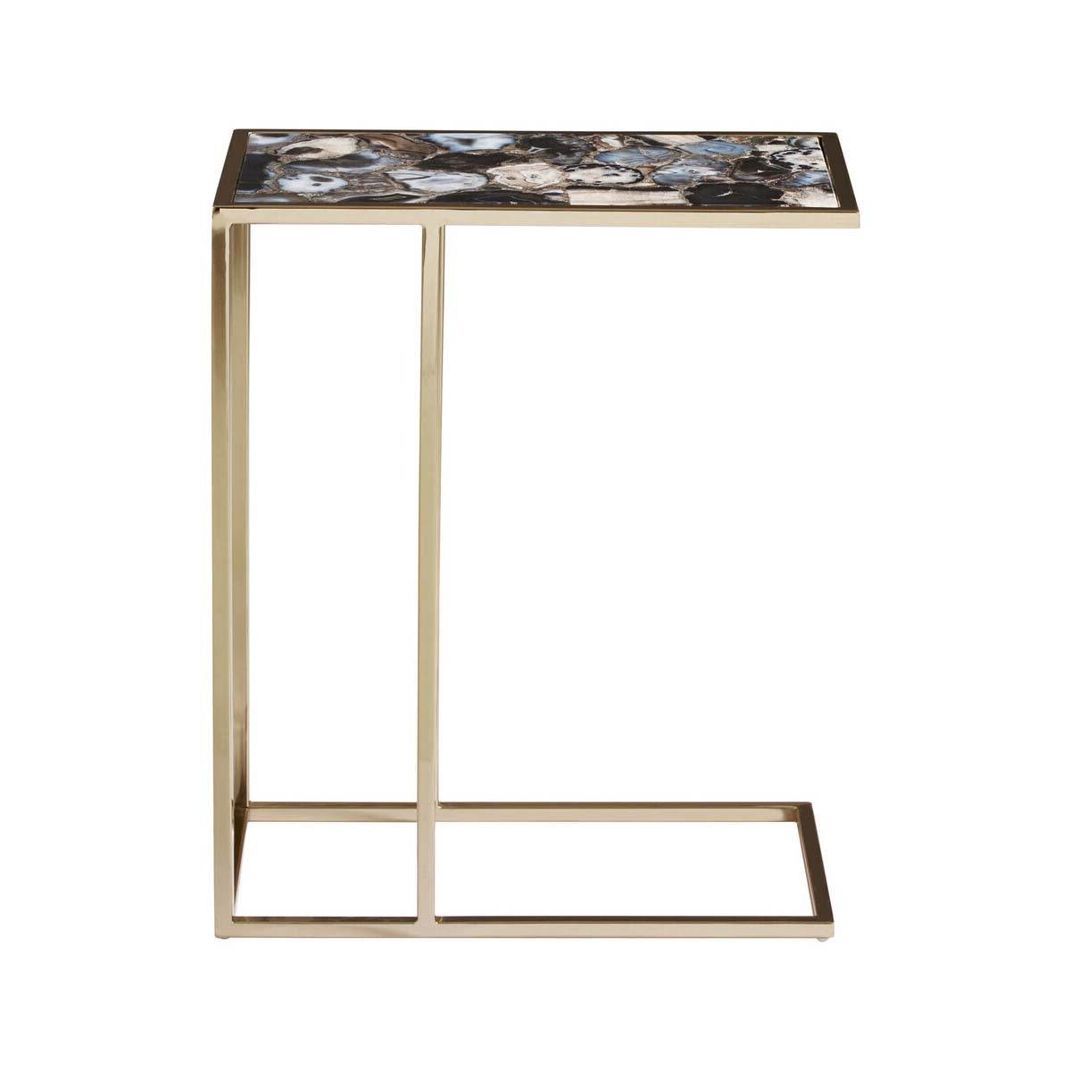 This side table top is crafted from semi-precious black agate stone featuring a banded pattern with asymmetric natural trim. The exquisite top rests above the gold finish sculptural frame that contributes to modern minimalism.