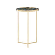 This side table's top is crafted from semi-precious blue agate stone featuring a banded pattern with asymmetric natural trim. The exquisite top rests in the gold finish sculptural frame that contributes to modern minimalism.