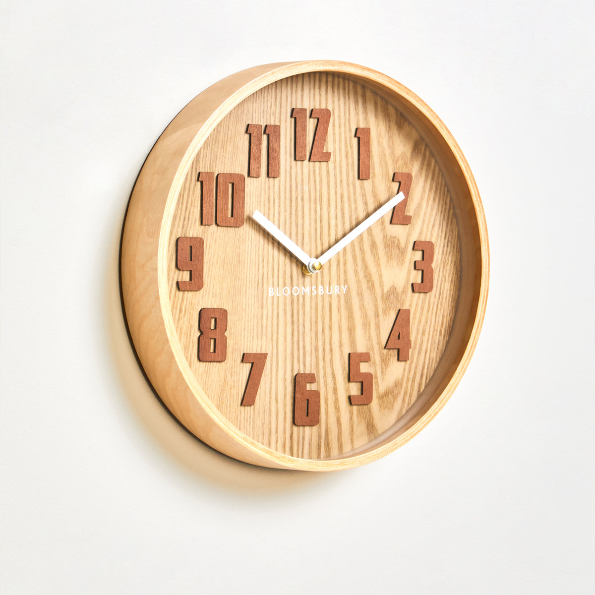 The round case is made from natural wood and has a light brown finish that blends in with the dials darker tone. The large numbers are coloured brown and have an aesthetic that evokes 1970s chic. Its minimal white hands are easy to read. White text stating Bloomsbury is displayed beneath the hands, and a clear glass pane covers the dial.