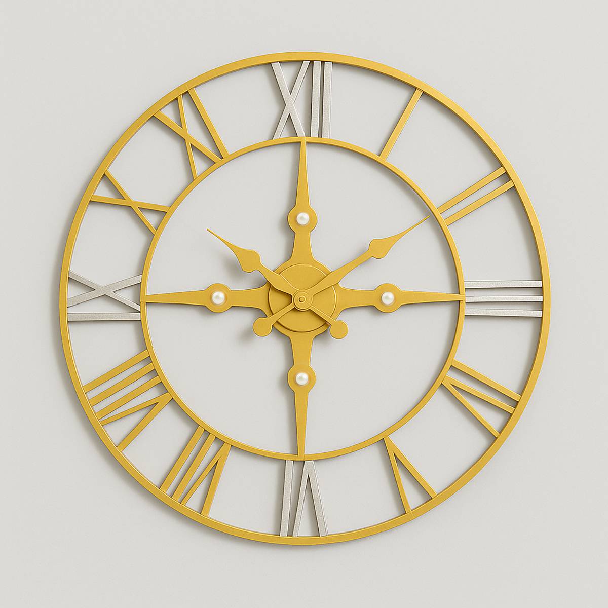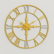This traditional wall clock features classic Roman numerals with a unique twist: the 12, 3, 6, and 9 hour markers boast a silver finish, while the remaining markers are gold. Crafted from sturdy metal, this round wall clock creates a captivating contrast. The spade-shaped hands and detailed centre add a touch of vintage elegance.