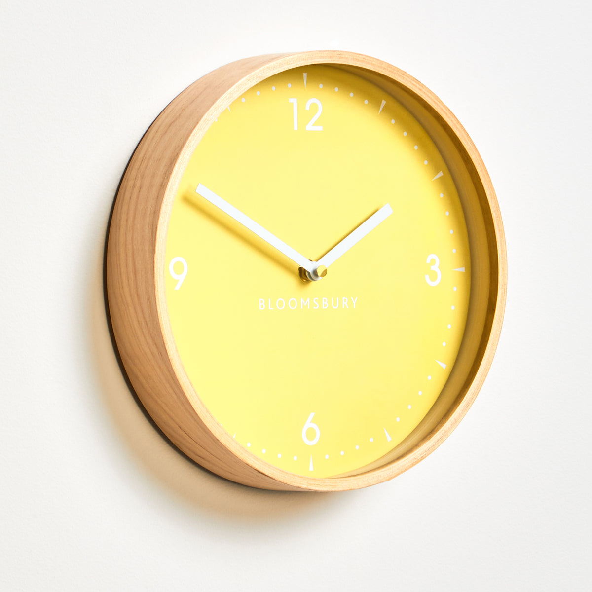 This traditional wall clock will make a timeless addition to a variety of home office decors. Made from sturdy wood and complete with premium quality glass, the face of this small analogue clock in the yellow finish is contrasted with natural round trim.