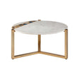 Its round top is crafted from a piece of tactile white marble. The table is supported by a trio of intersecting iron legs. The iron has a brass finish, lending a touch of metallic warmth to this piece.